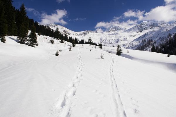 Schneeschuhspur und Schispur einträchtig nebeneinander