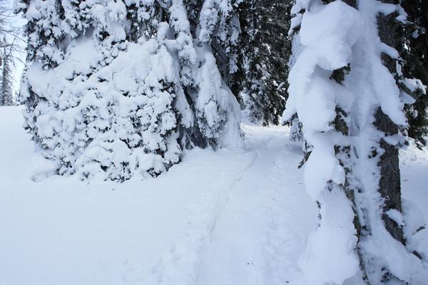 Weiter oben treffe ich auf einen Schneeschuhpfad.