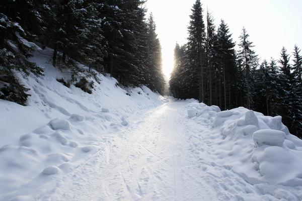 Aufwärts über die von zahlreichen Schispuren gezeichnete Forststraße
