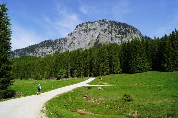 Start beim Parkplatz Schönmoos oberhalb von Wörschach in über 1.100 Meter Seehöhe. Vor uns das Gipfelziel: Der Hochtausing, den wir von rechts nach links überschreiten wollen.
