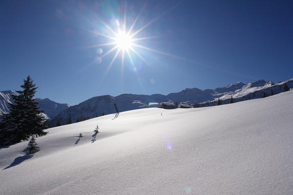 Das freie Gelände der Modereggalm ist erreicht. Wir werden von strahlendem Sonnenschein begrüßt, der uns heute den ganzen Tag über treu bleiben wird.