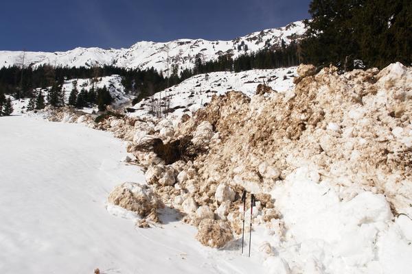 ... ein Lawinenkegel nach dem anderen. Bis zu geschätzten 5 bis 10 Meter türmen sich die Schneemassen auf (Siehe meine 1,25 Meter langen Tourenschistöcke).