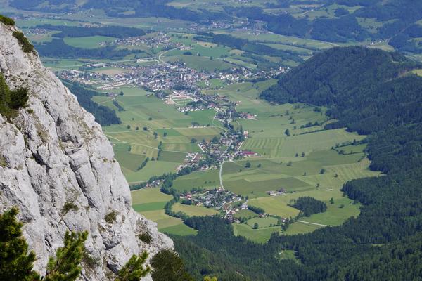 Gröbming, ca. 100 Höhenmeter über dem Ennsboden (rechts oben) gelegen.