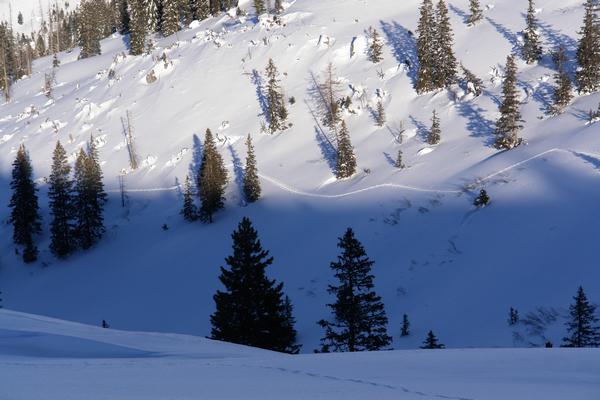 Nach kurzer Rast gehts auf der Anstiegsspur (am Übergang zwischen Schatten und Licht) wieder zurück.